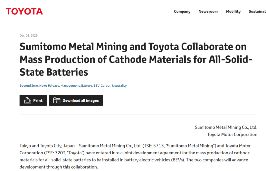10月8日,丰田汽车环球官网公布动静称,住友金属矿山株式会社(以下简称“住友金属矿山”)与丰田汽车就量产用于纯电动汽车(BEV)的全固态电池正极质料杀青互助订定。两边将通过此次互助推动研发过程。丰田汽车还正在文内重申,准备于2027年至2028年间推出搭载全固态电池的纯电动汽车。