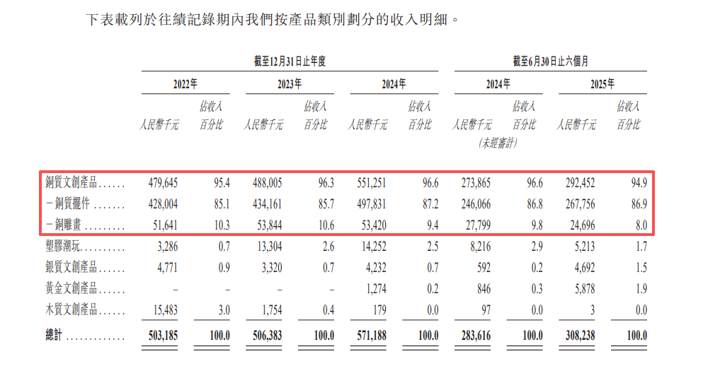 铜师傅招股书显示,近三年众来,铜质文创产物永远功勋着近九成五的营收,塑胶潮玩、银质文创、黄金文创等再造意合计占比缺乏5%。